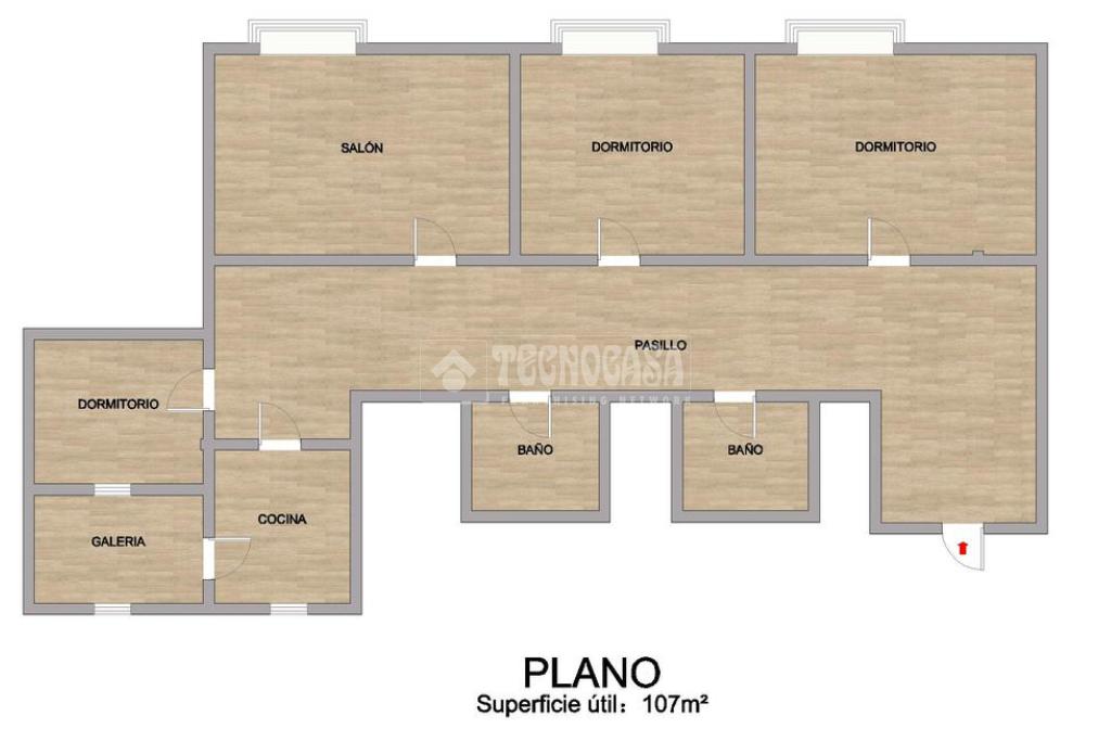 Al entrar nos encontramos con un hall de entrada que da acceso al pasillo que distribuye a los dos dormitorios y gran salón exterior, todos estos con salida a balcon y orientados a la calle Greco. A mano izquierda tendríamos los dos baños completos. Luego hay un pequeño pasillo del que salen todas las demás estancias. En este caso nos encontramos a mano derecha la tercera habitación y de frente la cocina con galeria y orientación sur.